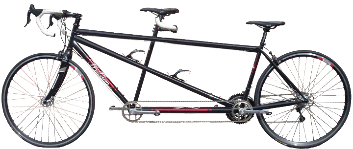 You don't have to put up with the dis-advantages of carbon fiber to get a light tandem. There's no need to sacrifice ride quality (not to mention $$$$) if you want the lightest, trickiest tandem built. Here's the tandem that's been turning all the heads over the last few years. It's a steel tandem that actually weighs 26.8 pounds with pedals and bottle cages installed. Of course, the weight varies by size, and the one that is pictured here is a medium size. The bottom brackets, hubs, seat posts, etc. are all components that will hold up to tandem riding. Believe it or not, many manufacturers use carbon fiber seat posts to make their tandems light! Carbon fiber seat posts should never be used as a captain seat post in a tandem. Another trick that manufacturers use to make their tandems light is to use wheels that are designed for road racing single bikes. Road bike wheels fall apart quickly under tandem stresses. The wheels on our uber-light tandem are hand built specifically for tandem use, and they are much more durable than under-weight road bike wheels. The first rule of building a tandem is to use parts that will hold up to tandem rinding. Otherwise, your putting your customers at risk of injury. Another issue is a matter of... well... honesty. My philosophy is that if a customer is paying for light weight, they should not accept a bike that weighs more than a manufacturer claims. I've actually weighed some other companies light weight tandems and found that some actually weighed up to 30% more than their claimed weights.